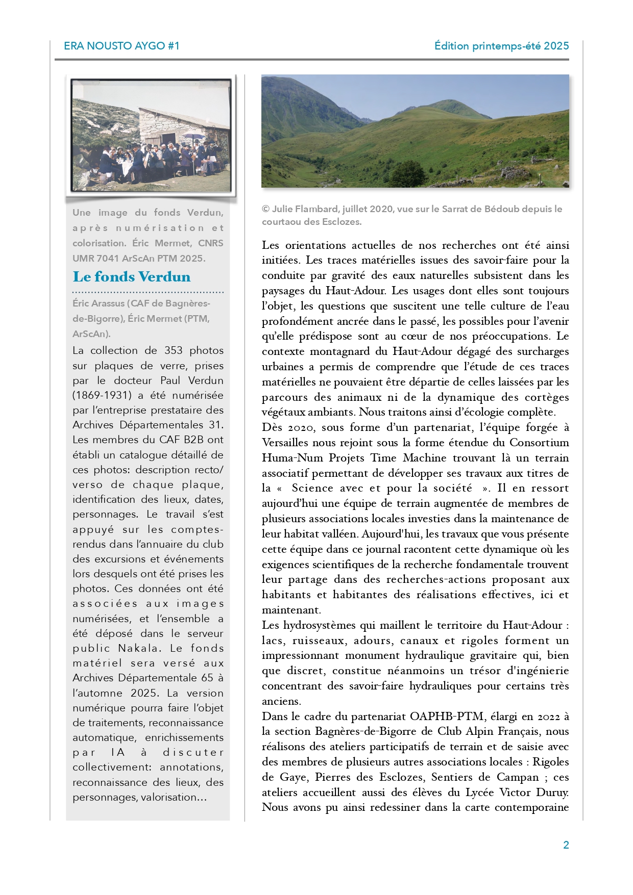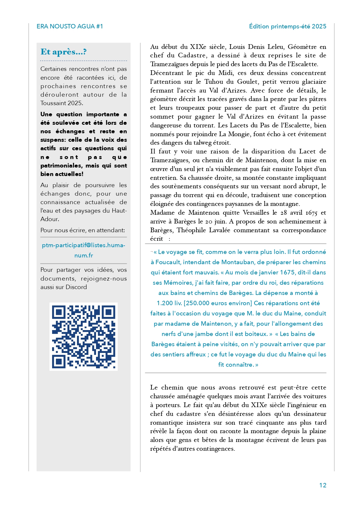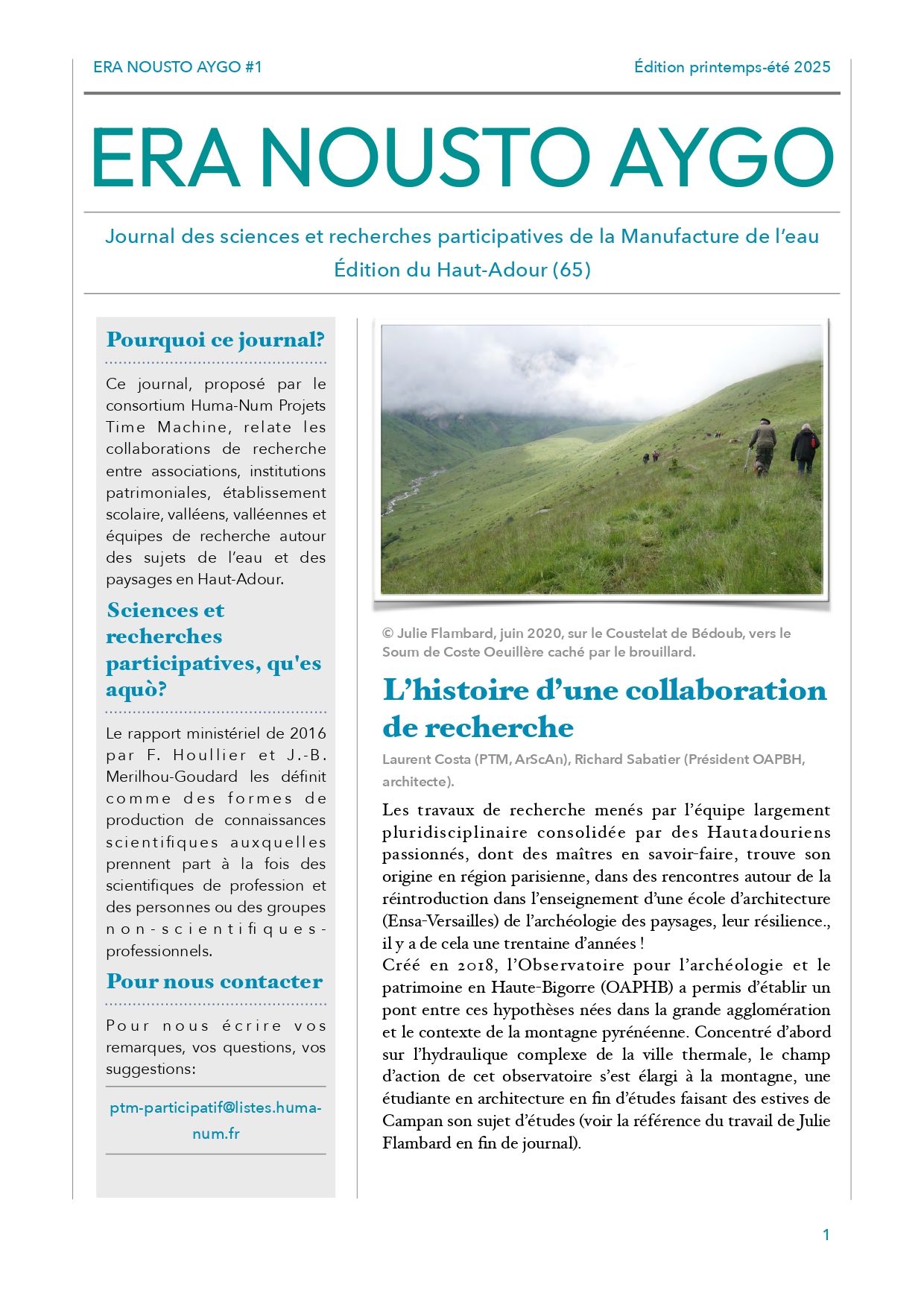 Le consortium PTM est résolument engagé dans des démarches de sciences avec et pour la société (SAPS), articulant sciences du patrimoine et participation citoyenne. Une première édition d’un journal de sciences et recherches participatives, rédigé dans le cadre du projet de la Manufacture de l’eau, relate les échanges qui se déroulent entre le consortium et les habitantes et habitants du Haut-Adour, ainsi que les travaux réalisés conjointement.