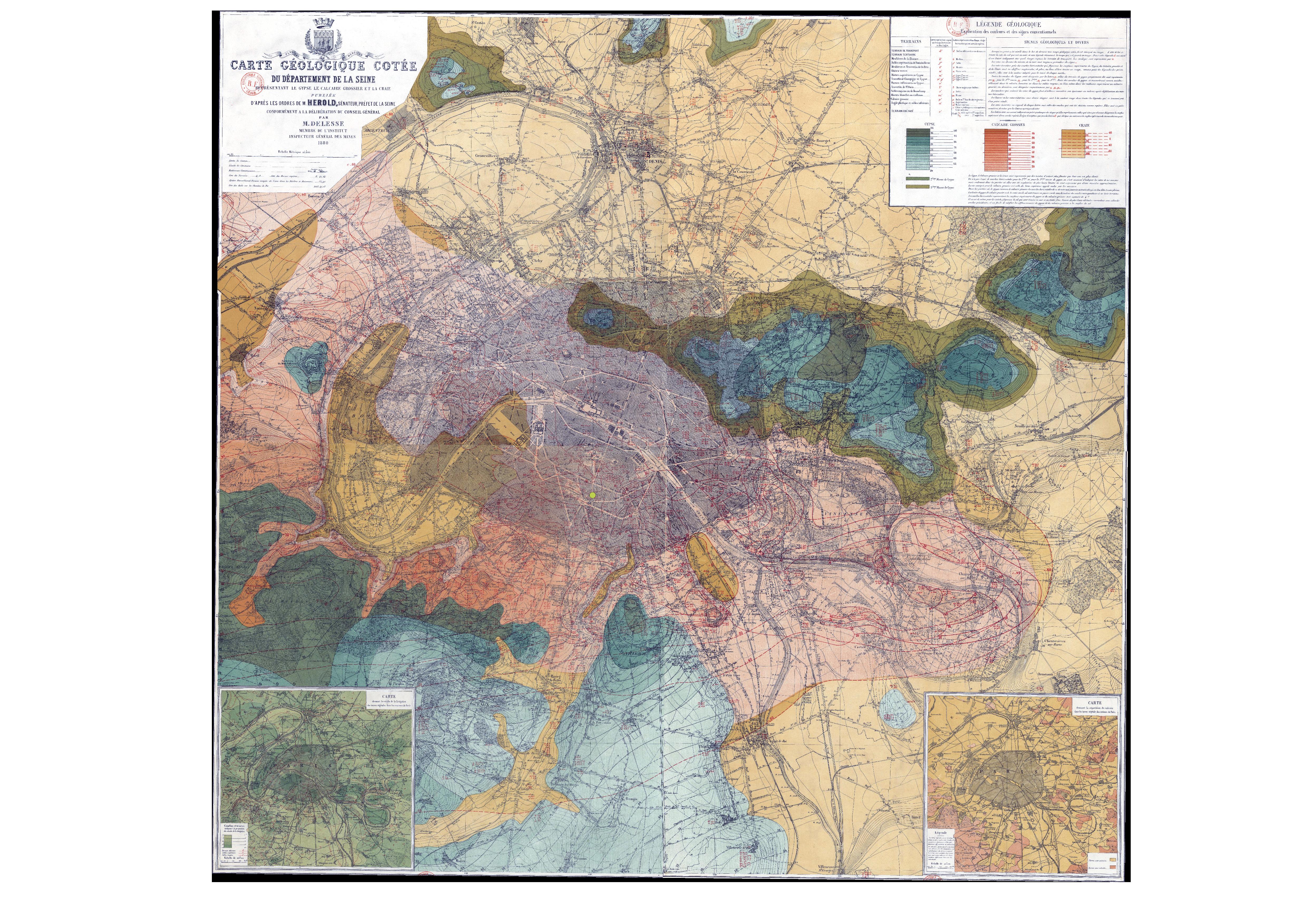 DELESSE A., 1880, Carte géologique cotée du département de la Seine représentant le gypse, le calcaire grossier et la craie, d’après les ordres de M. Hérold, sénateur, préfet de la Seine, conformément à la décision du conseil général, L. Wuhrer, Paris, 1 Pl.